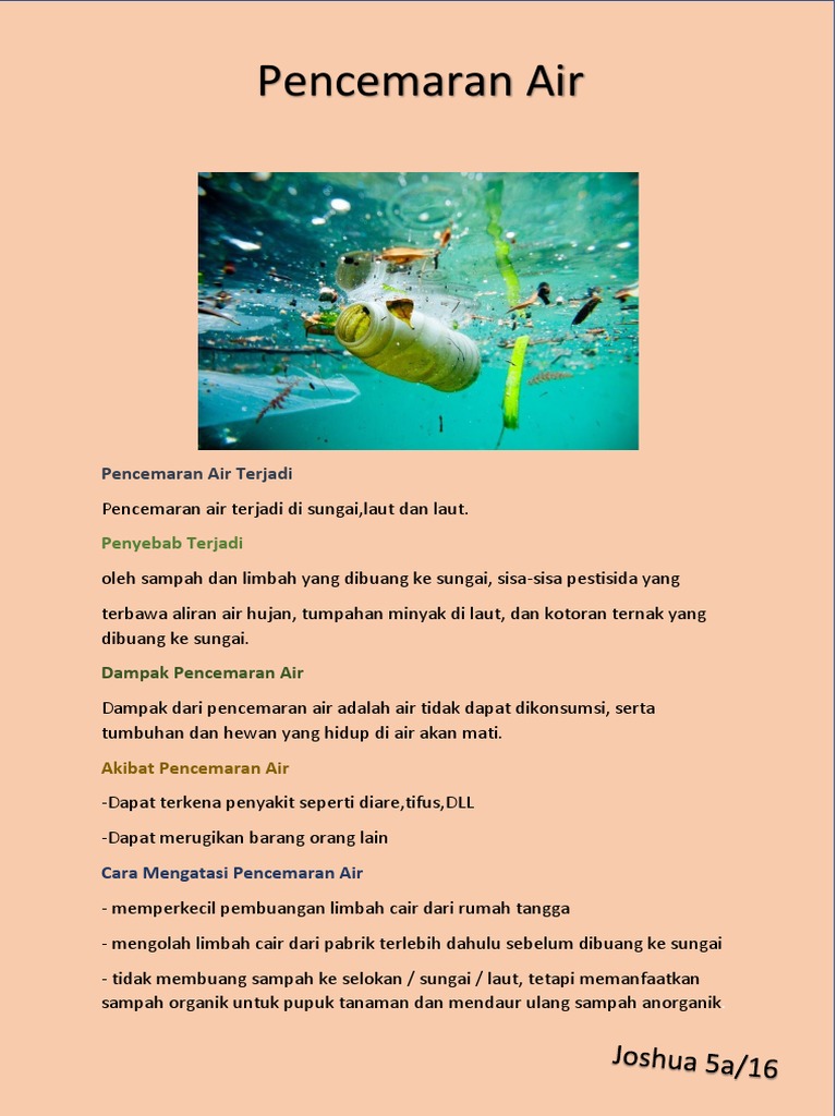 Kelas 3 - air nampak bersih tidak berbau tetapi kualitinya tercemar dan orang ramai tidak boleh berenang tetapi boleh berkelah. Terakhir adalah langkah-langkah cara mencegah pencemaran lingkungan dalam hal ini tanah. Pencemaran berlaku sama ada dari.